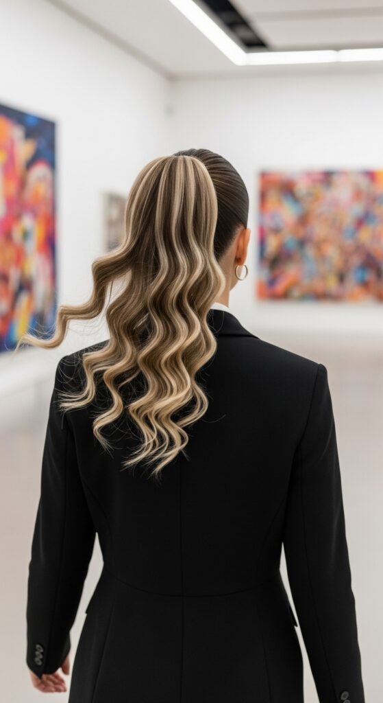 It’s a great way to incorporate a touch of glitchy glam hair detail—something slightly unexpected in a very polished format. Secure the ends into the ponytail for a seamless finish.