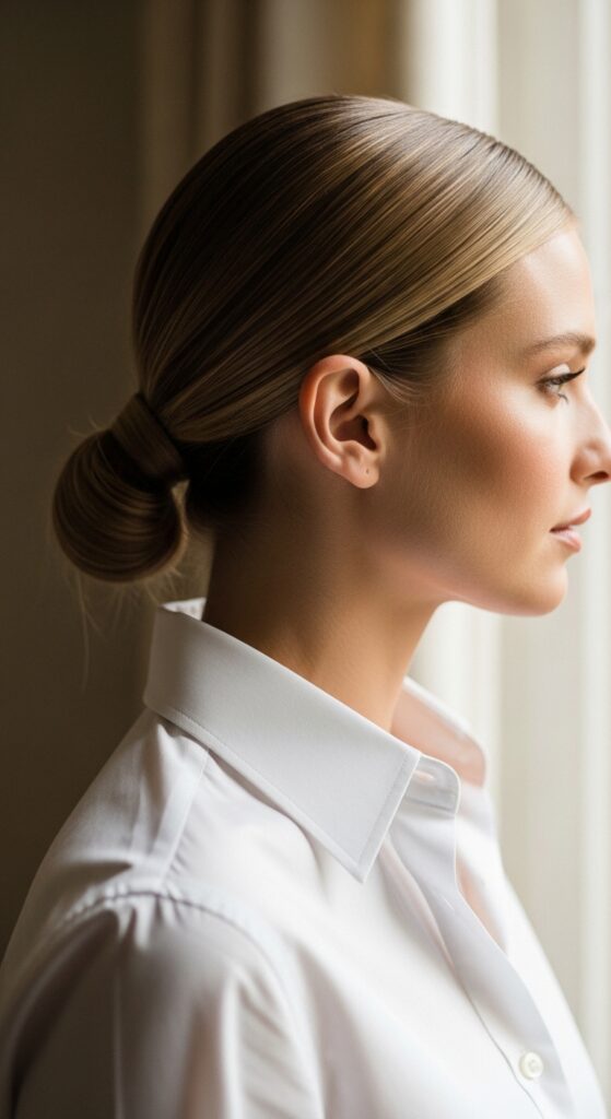 The key is impeccable smoothness. Apply a smoothing cream from roots to ends before brushing it all back. Secure it low, right at the nape of your neck, for that graceful silhouette.