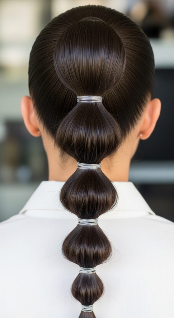 Create your high ponytail first. Then, space out small elastics down the length of the tail. Gently pull on each section between bands to create the full “bubble” effect.