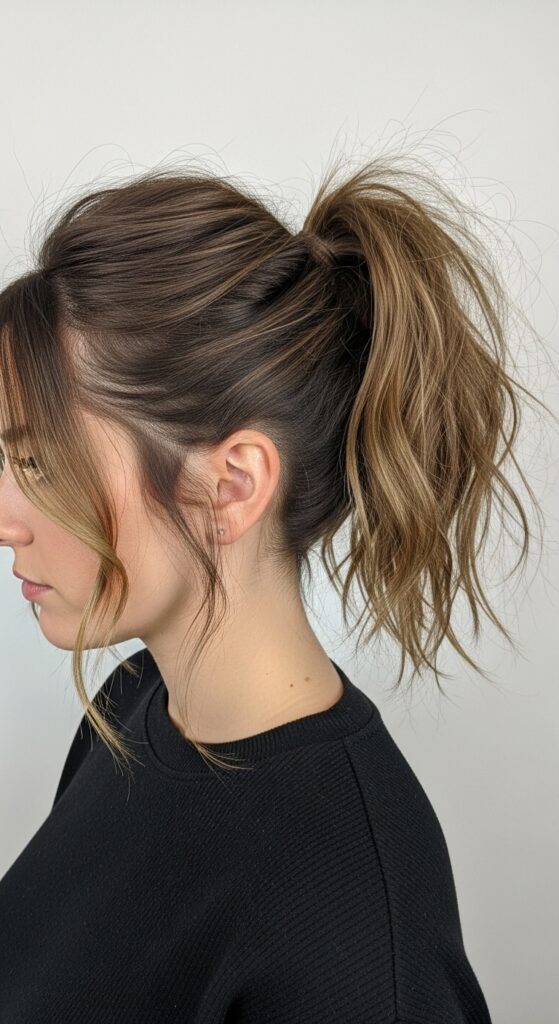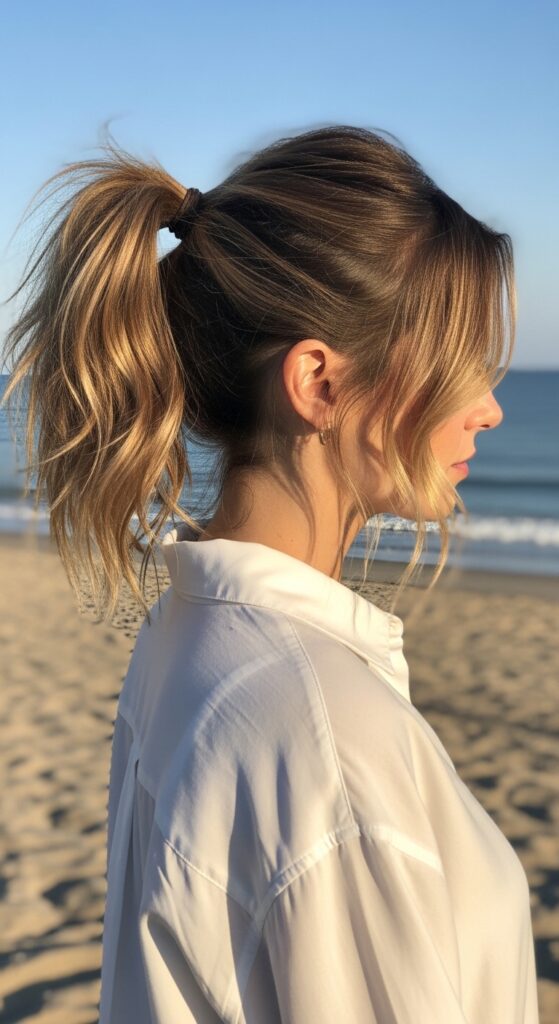 This technique prevents your ponytail from looking too harsh or “done.” Those little pieces soften your features and make the style look more intentional and less perfect.