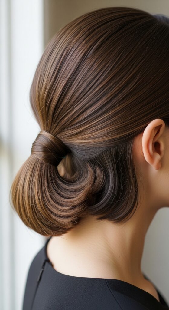 Create a low ponytail. Instead of letting it hang, twist the length, loop it under, and pin it flat against the base of your neck with bobby pins. Smooth the sides.