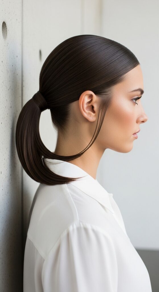 Apply a smoothing cream from roots to ends. Pull hair back gently, leaving a few face-framing pieces loose. Secure with a hair tie that matches your hair color. Wrap a small section of hair around the base to conceal the elastic.