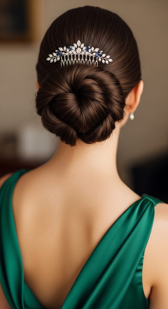Brush all your hair to one side at the nape of your neck. Twist it upwards toward the crown of your head, tucking in the ends. Secure with U-pins vertically along the twist. A decorative comb at the top adds a beautiful finish.