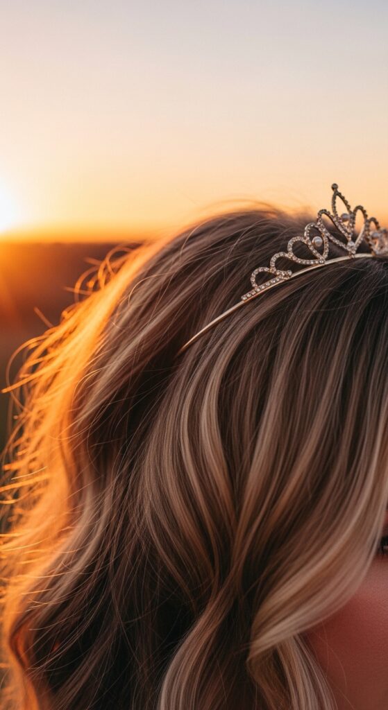 Spray salt spray on damp hair and let it air-dry or diffuse. Once dry, use a curling wand to enhance random sections. Place a dainty tiara or crown right where your hair parts, pushing it in securely.
