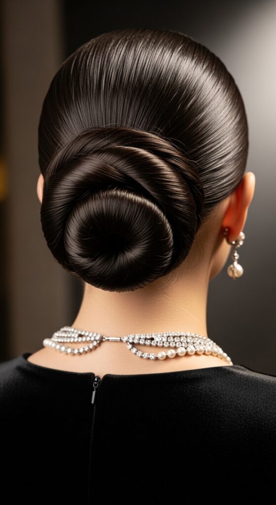 Start with a smoothing serum on damp hair. Blow-dry straight, then gather your hair at the nape of your neck. Twist it into a tight bun and secure with pins. Use a strong-hold hairspray and a toothbrush to slick down any baby hairs.
