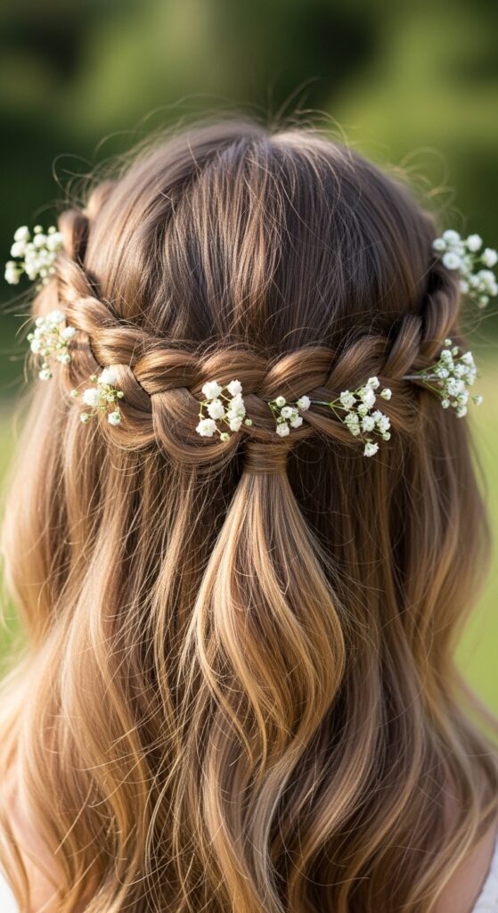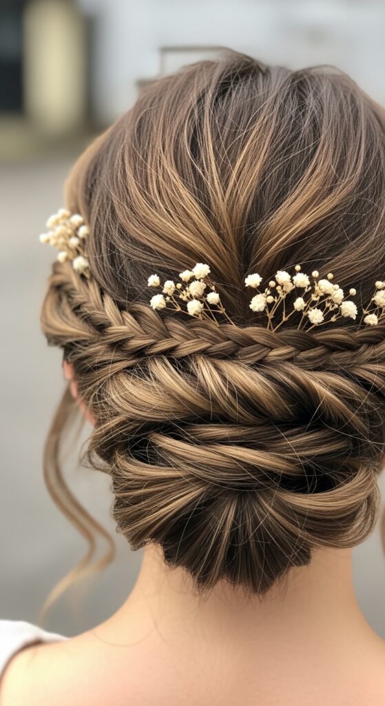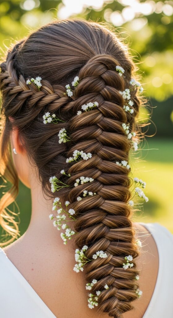 Create a loose side fishtail braid. Before you start, have small, sturdy flowers (like mini roses or daisies) on hand. As you braid, gently insert the stems into the sections. Secure the end with a clear elastic.