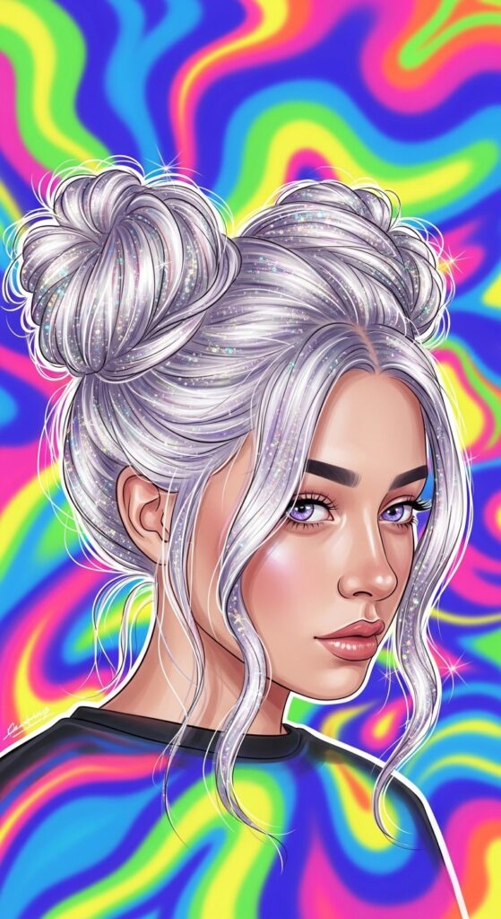 Create two high ponytails. Twist each into a bun, but don’t pin them too neatly. Pull out strands intentionally. Use a glitter gel or tiny silver clips to create a “glitched” accessory effect.