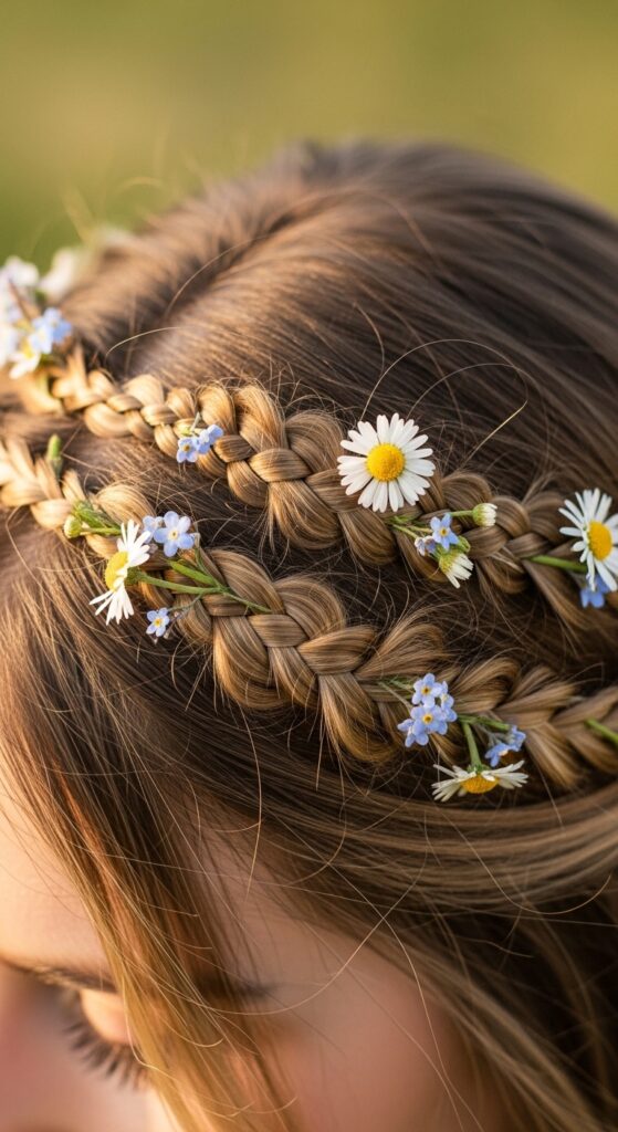 Use regular three-strand braids or loose fishtails. Wrap them across your head, pinning as you go. Let the ends blend into the rest of your hair or tuck them under.