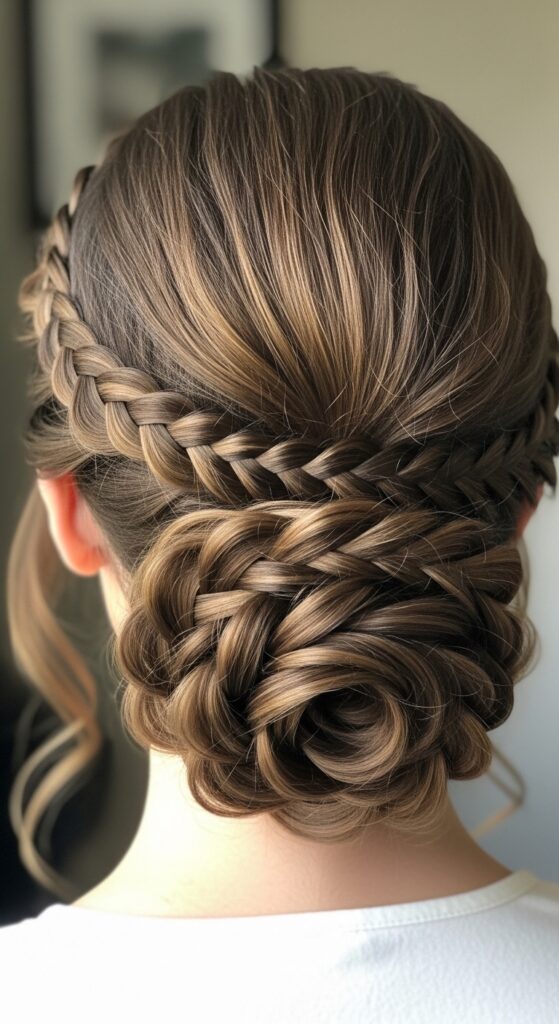 This is a two-in-one style that looks incredibly skilled. The Dutch braid adds stunning detail to the crown of your head, while the low bun keeps it elegant and secure for a long day of dancing.