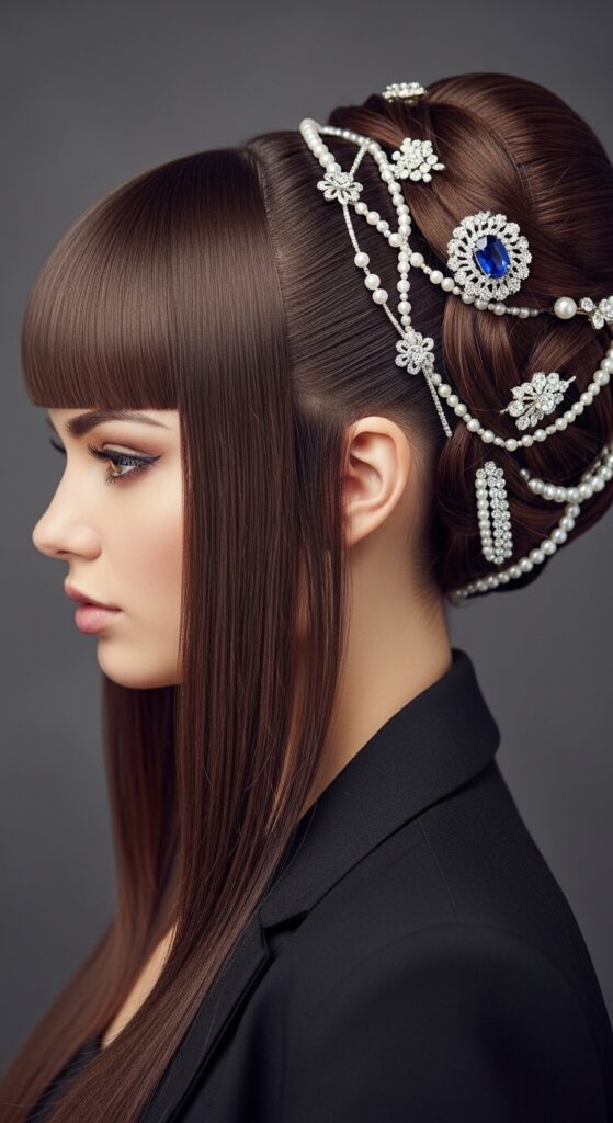 The hime cut is having a major moment, and its elements translate beautifully to updos. Think: bold, straight-across bangs and those iconic long, face-framing side locks. It’s a regal, storybook look.