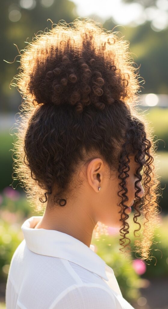 For maximum volume, flip your head over when gathering the ponytail. Use a coil-friendly gel or mousse to define both the bun and your free-hanging tendrils.
