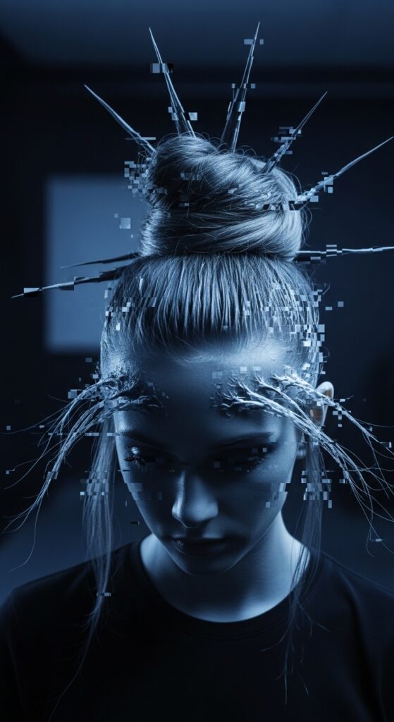 Glitchy glam hair is the edgy, futuristic cousin of the romantic updo. It’s about looking artfully disheveled, like a beautiful digital error. Tendrils aren’t just soft here—they’re piece-y, textured, and intentional.