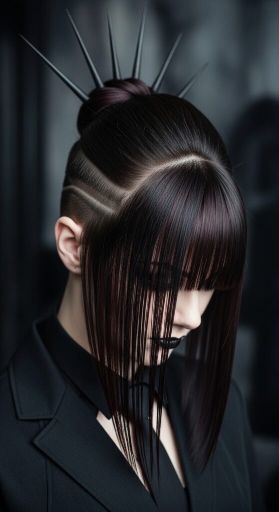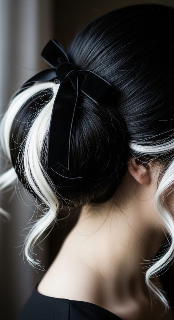 Romantic goth hairstyles are all about contrast and drama. Imagine a severe, sleek low bun paired with pieces that are either strikingly light or a different texture. It’s poetic and powerful.