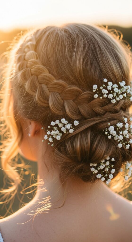 • Tuck ends and pin. Pull out soft tendrils around your face and tuck in tiny sprigs of baby’s breath.