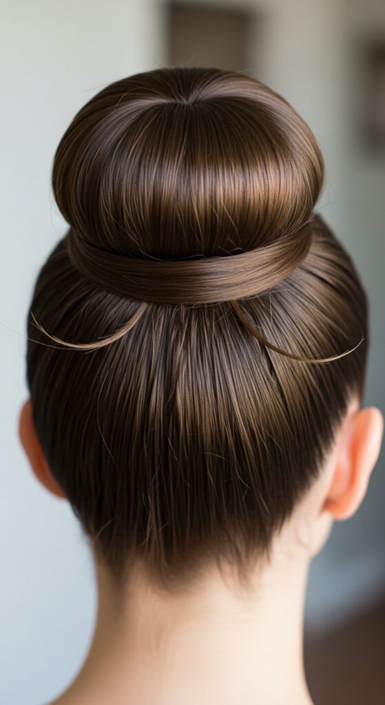 This is the pinnacle of quiet luxury hair. It’s the perfectly imperfect bun you see on style icons. The bun itself is high, tight, and immaculate. The tendrils are so subtle you might miss them—just a whisper of softness.