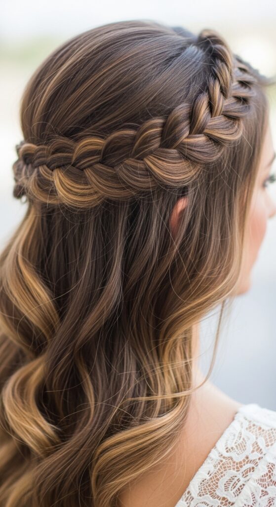 Feel like a queen for the day. A braided crown is ethereal and keeps hair completely off your face. By leaving the back hair down, you get the security of an updo with the romance of long, flowing waves.