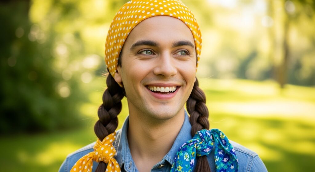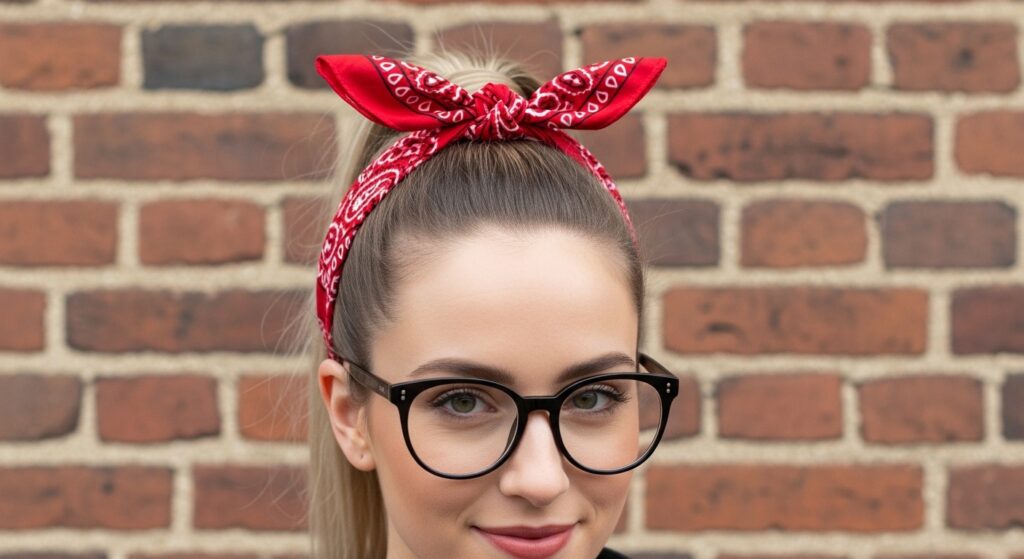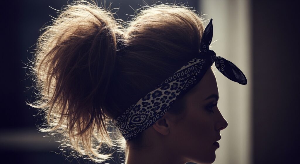 Subvert the sweet bandana with some 1970s/80s punk rock attitude. Tie a bandana around a high, messy ponytail, but let the knot sit at the side or under the ponytail for a rougher feel. Pair it with teased hair, leather jackets, and a defiant smirk. Animal prints, black, or plaid bandanas work exceptionally well here. It’s about effortless rebellion.