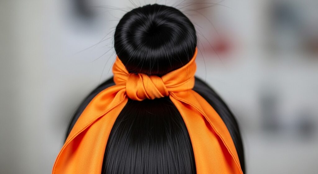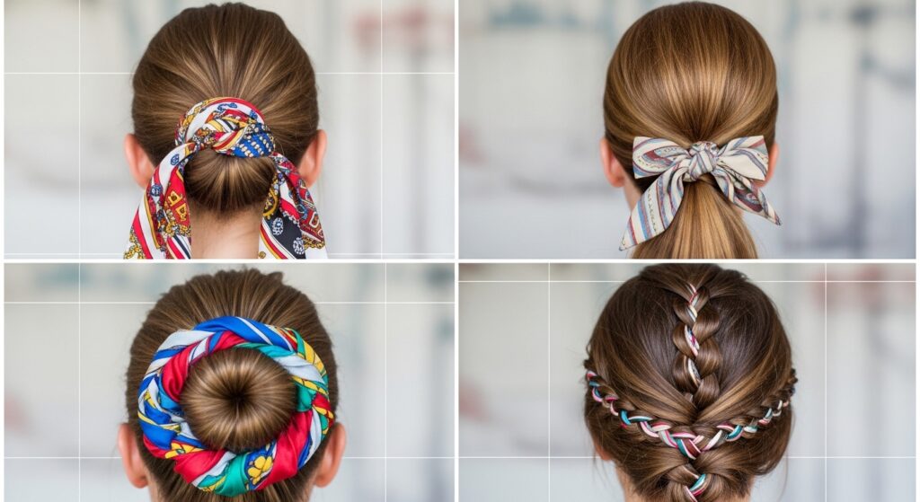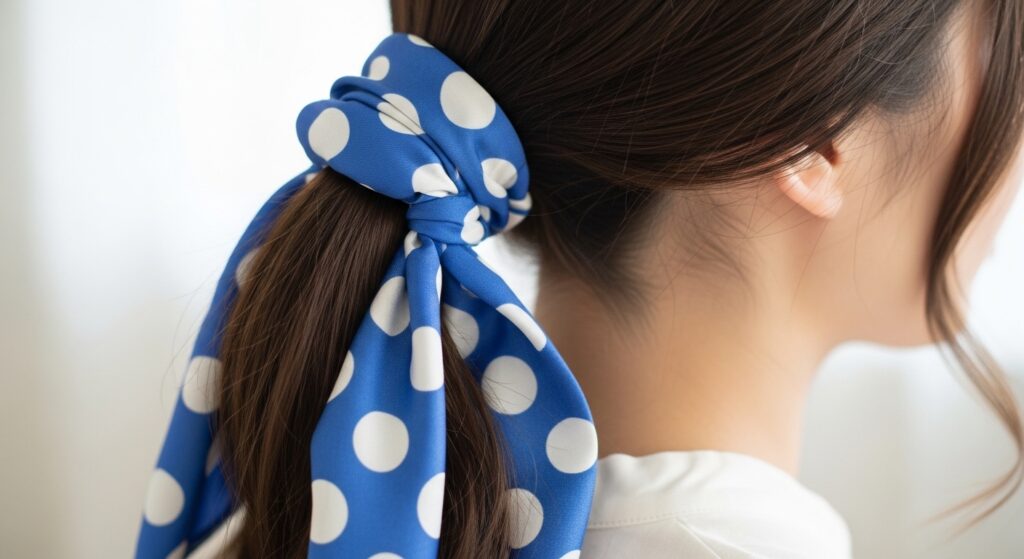 This 1950s and 1980s preppy revival involves using a small, square silk scarf as a chic ponytail holder itself. Lay the scarf flat, place the ponytail in the center, gather the scarf corners, and tie them tightly around the hair. This creates a beautiful, gathered effect where the scarf becomes the actual tie, with soft fabric poufing out. It’s polished, feminine, and perfect for the office or a garden party.