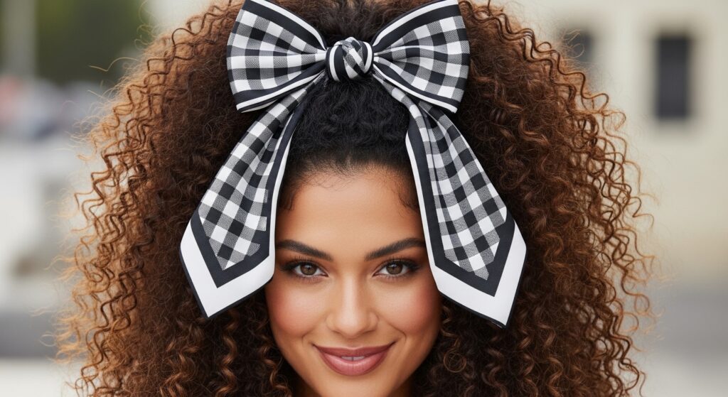 Merge two timeless trends with this delightful style. Take the top section of your hair to create a half-up ponytail. Before securing it with an elastic, incorporate a long, thin scarf. Tie it into an oversized, dramatic bow. This look has dual-era appeal: the sweet, girlish charm of the 1950s and the exaggerated accessory trend of the late 1980s. Let the rest of your hair flow loose and voluminous for maximum impact.