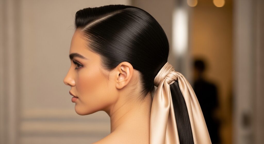 Channel old Hollywood glamour with a deep side part and a low, sleek ponytail. Take a slender, satin scarf and tie it around the base, finishing with a small, delicate knot. This style is all about polished sophistication and draws direct inspiration from the silver screen sirens of the 1940s and 1950s. It protects your hairline with satin while looking impeccably chic.