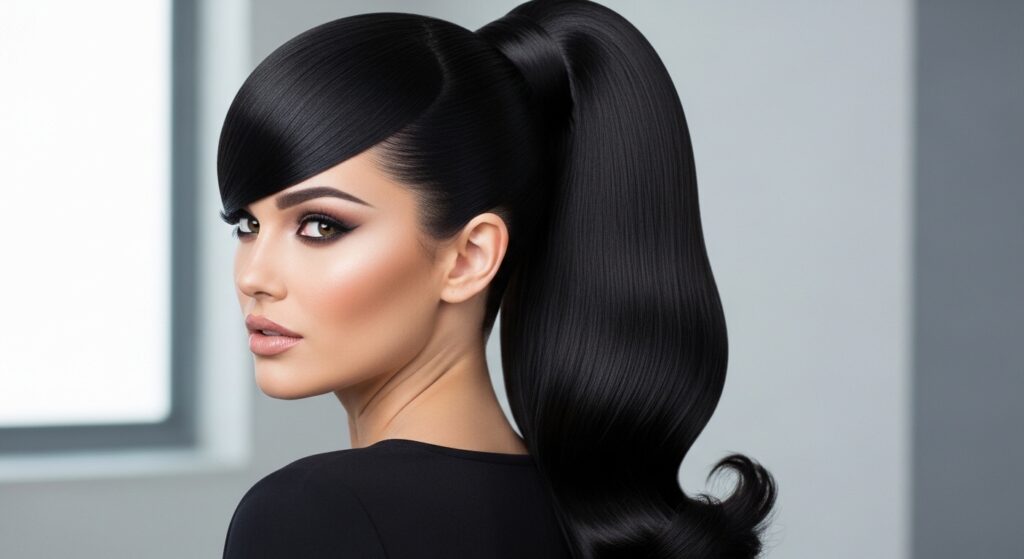 Our final technique is the pinnacle of sleek, editorial drama. The wet look ponytail is a study in extreme control and high-gloss finish.