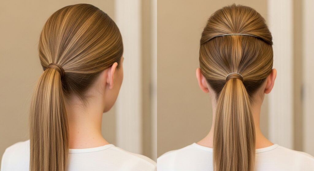 8. The Clear Elastic Bond: After securing with your main elastic, add a second, clear elastic a few inches down the tail. This weights and aligns the hair further, enhancing the sleek line.