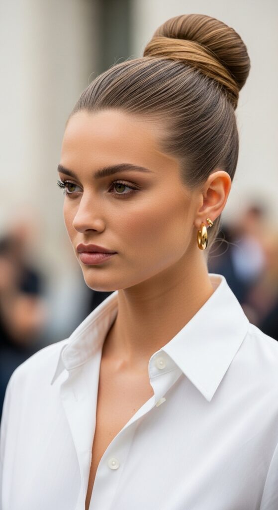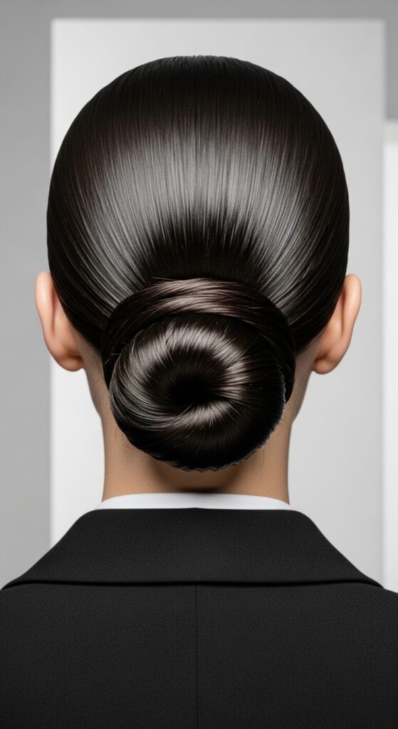 Embrace the gel! The wet look is a huge trend, and applying it to a sleek bun is stunning. It’s edgy, modern, and keeps every hair in place all day. It has a bit of that glitchy glam hair energy—polished with a twist.