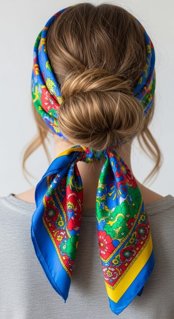 Fold a square scarf into a long strip. Make your messy bun. Tie the scarf around the base of the bun, letting the ends flow freely. You can also weave it through your hair before making the bun for a more integrated look.