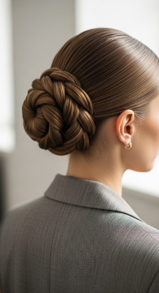 Create a low ponytail. Split it into two sections and twist them around each other. Then, wrap the twisted rope into a bun at the base and secure with pins. It’s structured yet soft, a perfect blend of professional and approachable.