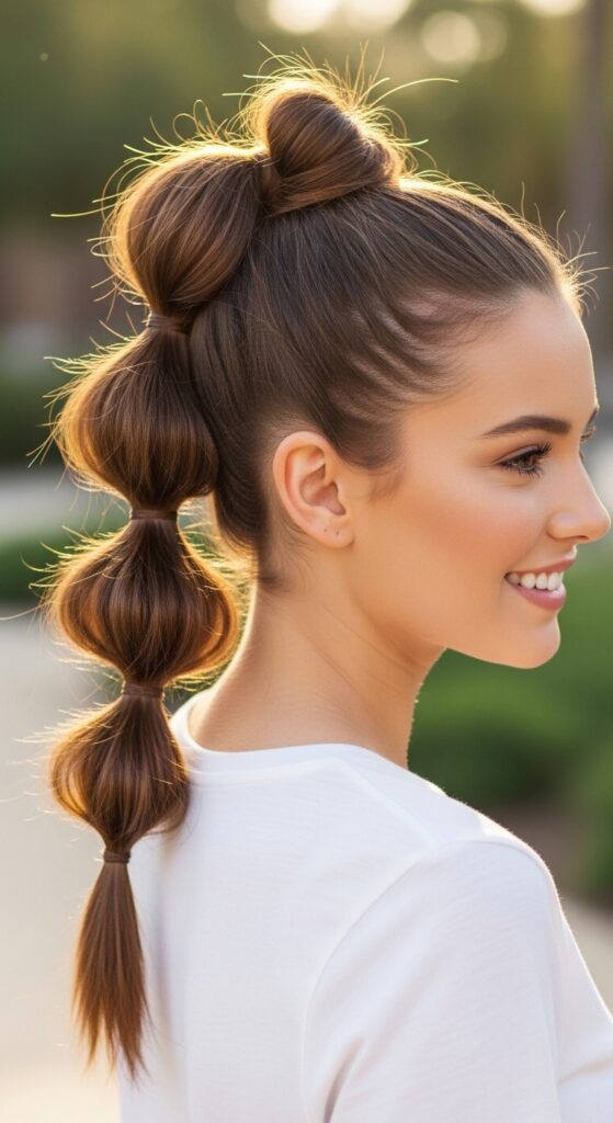 Create a high ponytail. Place small elastics every few inches down the length of the tail. Gently pull on each section between elastics to puff it out into a “bubble.” Finally, twist the end into a small bun.