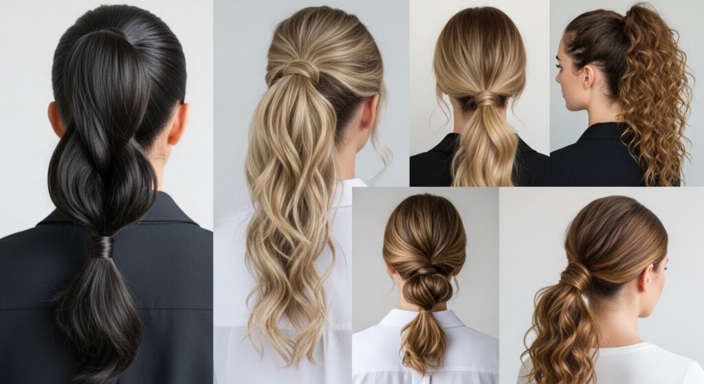 11. Cascading Twist Pony: Start with a deep side part. Take a section from the heavier side, twist it back, adding hair as you go (a French twist). Secure it at the nape, then gather all hair into a low side ponytail. Let smaller twists cascade from the base.