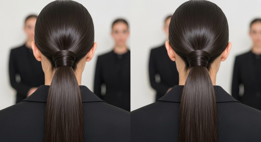 3. Hidden Twist Low Pony: Create a low ponytail, but before securing the final loop of the elastic, pull the tail through only halfway. Split the loop and pull the tail through the opposite direction, creating an elegant twisted knot at the base.