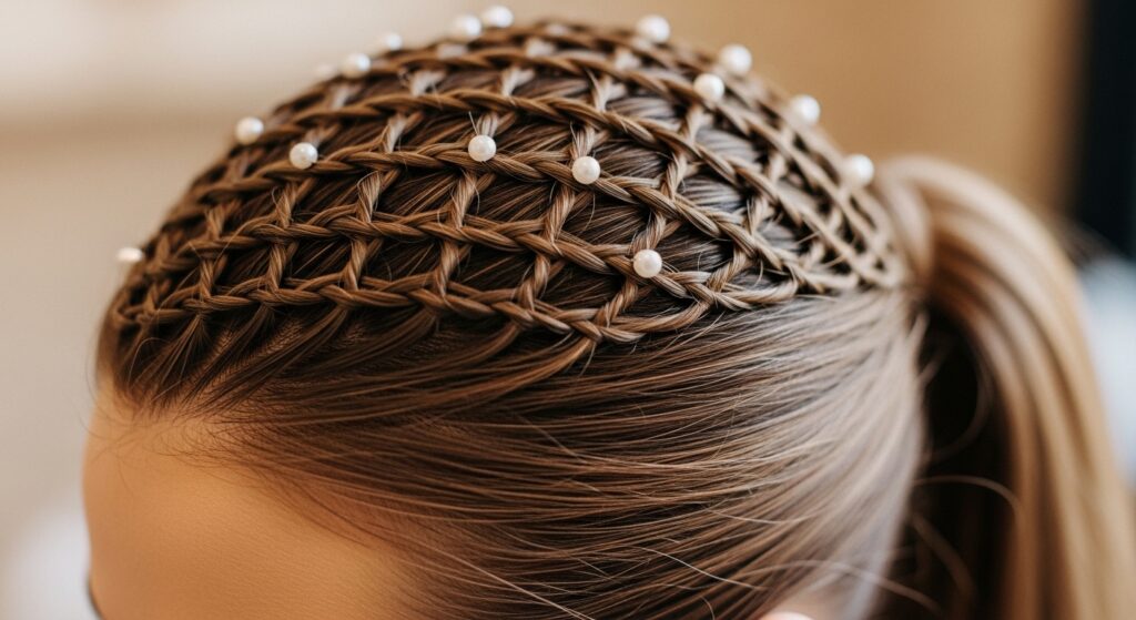 18. The Basket Weave Pony: Create multiple vertical rope twists from the front to the nape. Then, gather them into a ponytail, but before securing, weave a horizontal twisted strand through the vertical ones like a basket.