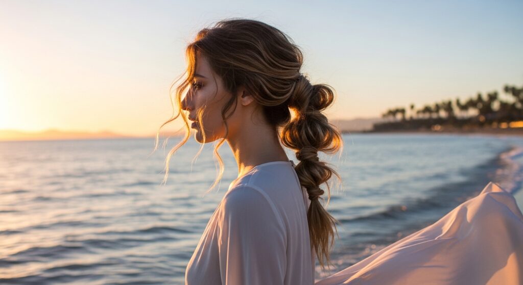 4. Twist-Braided Pony: Make two Dutch braids (braids inverted, crossing sections under) starting at your temples and joining into a low ponytail. It’s a braid-pony hybrid with incredible hold.