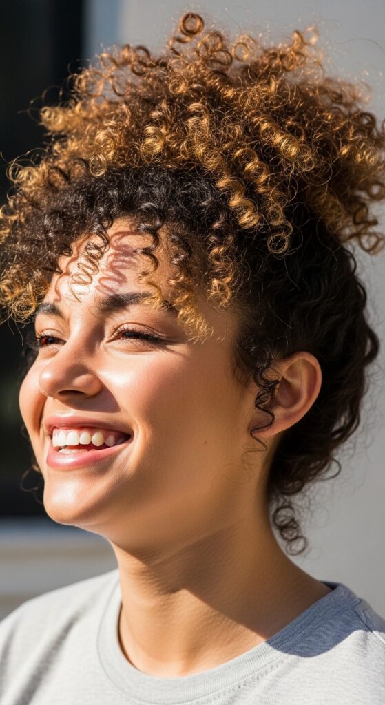 This keeps the curls stretched and out of your face while preserving your curl pattern. You can use a silk scrunchie so it doesn’t snag. It looks adorable and feels weightless. A light spritz of water in the morning refreshes everything.