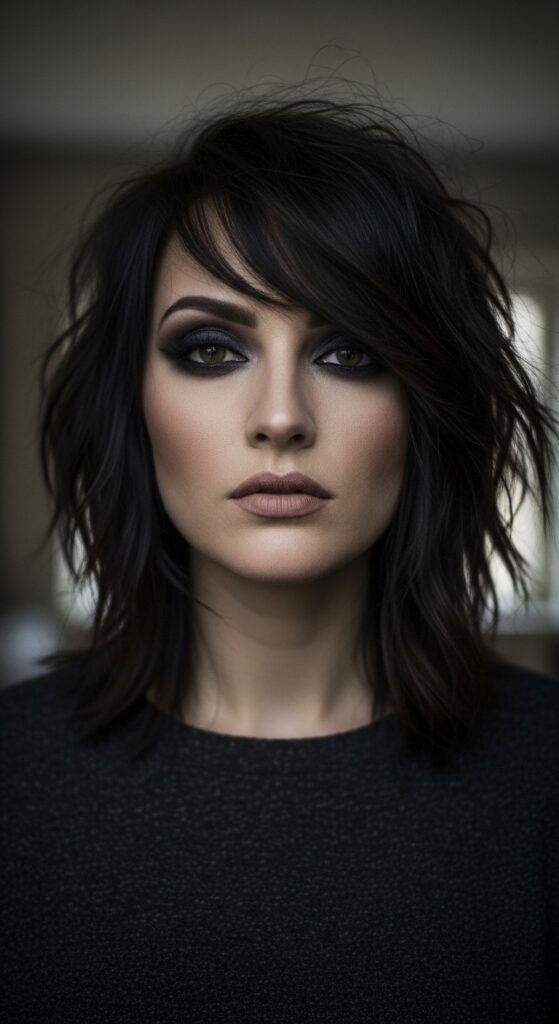 If you’re into the “romantic goth hairstyles” trend, this one’s for you. The vampire haircut features heavy, face-framing layers that start at the cheekbones and flow down.