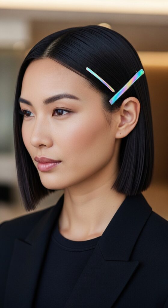 This classic “old money hair” style keeps your hair controlled and away from your face on one side. It works for all lengths, but looks especially stunning on lobs or shoulder-length cuts. No heat needed if your hair is naturally straight.