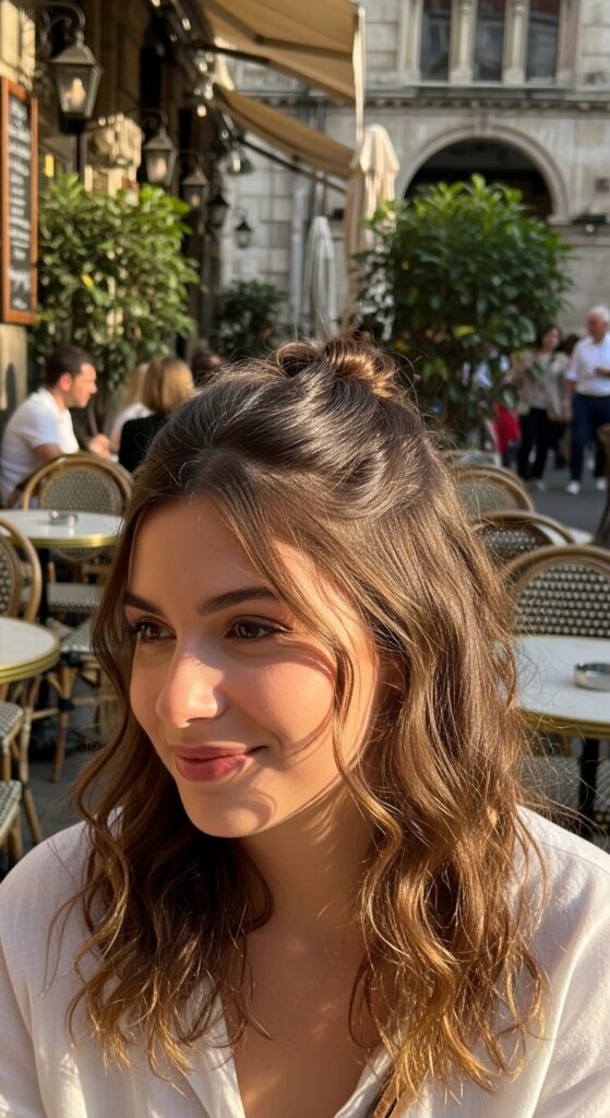 The half-up element keeps the heat off your forehead and neck while the waves add volume. It’s perfect for a summer evening date or a concert where you want to feel mysterious and cool.