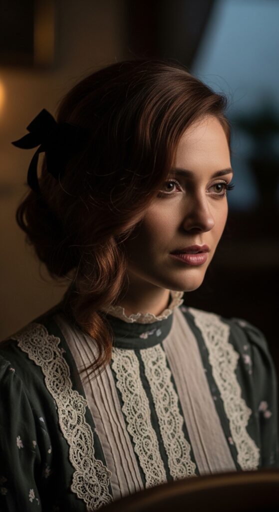 For fans of “romantic goth hairstyles,” this style is soft but still has an edge. Create loose waves using a braiding method, then pull the top half back and secure with a dark velvet or black bow.