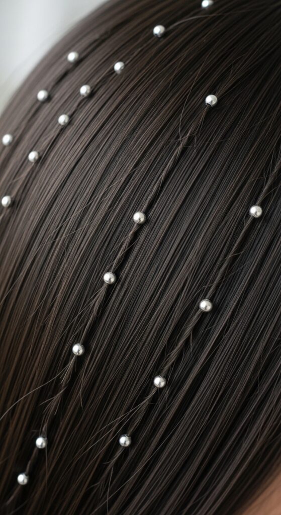 You don’t have to cut your hair to add texture. Threading small beads onto thin sections of your straight hair creates an instant dimensional look.