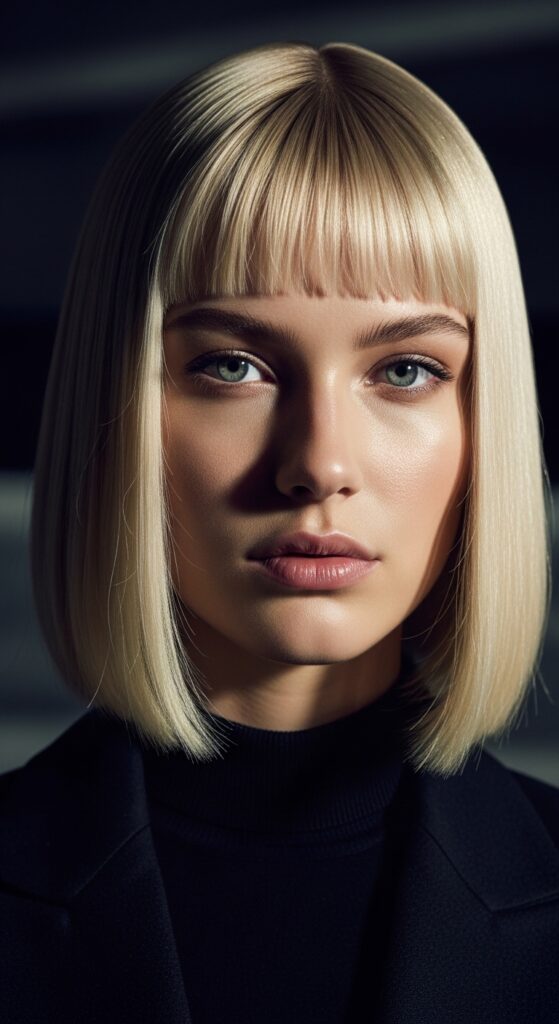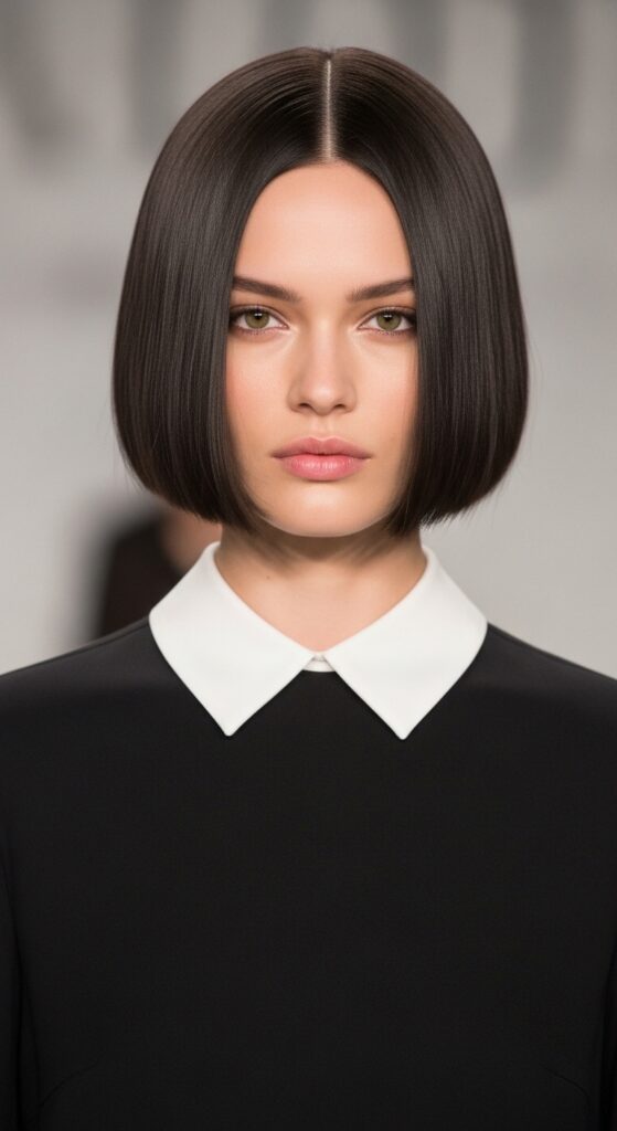 The button cut is a very precise, chin-length bob that parts perfectly in the center. It’s clean, sharp, and incredibly modern.