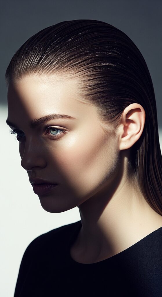 This is less about the cut and more about styling. Slicked-back hair creates a very sharp, high-fashion dimension.