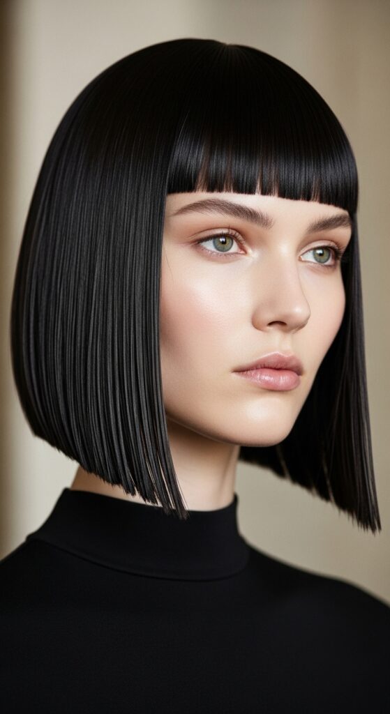 Micro bangs are bold, but when paired with a blunt cut on straight hair, they’re incredibly chic. It’s all about shine and a very clean line.
