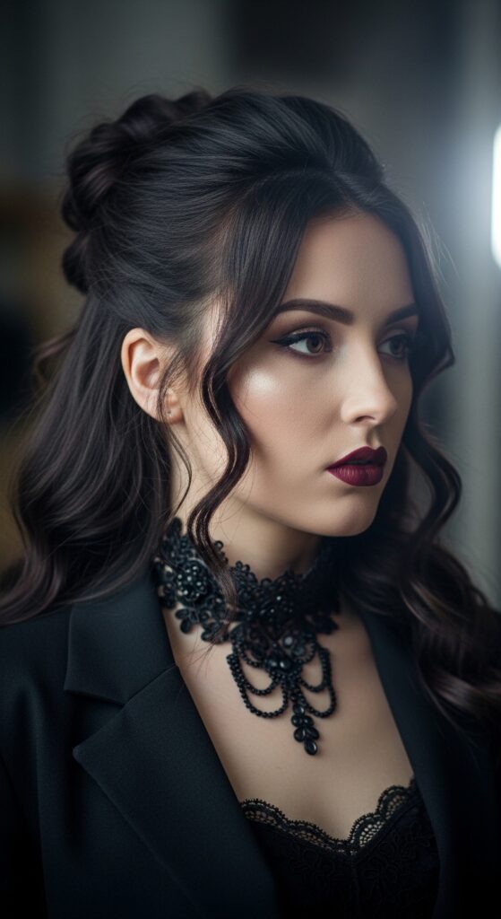 The romantic goth aesthetic is all about dark romance. A twisted half-up style fits perfectly. Create a deep side part, then twist sections back, leaving some hair down.
