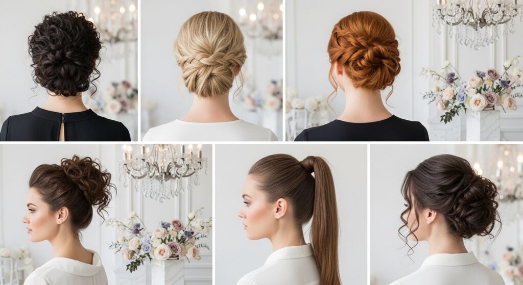 The French Twist: A vintage Hollywood staple that exudes old-world glamour. Hair is folded and tucked upwards into a sleek, vertical roll. It’s sophisticated, slightly formidable, and works exceptionally well with one-shoulder or high-neck gowns.
