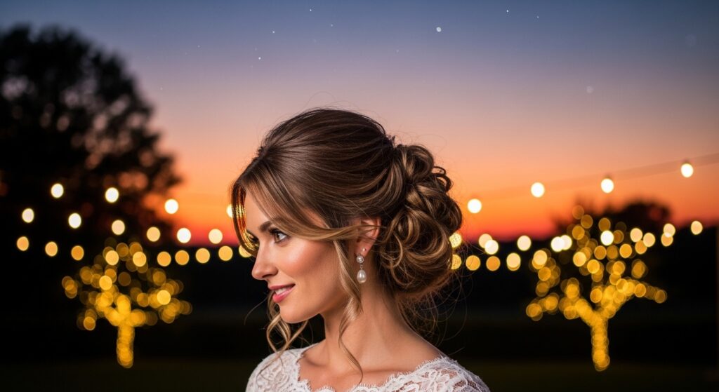 The Textured Messy Bun: Don’t let the name fool you—this is artfully crafted “mess.” With loose tendrils, pulled-out volume, and a relaxed bun shape, this style feels modern, approachable, and wonderfully romantic. It balances the formality of the attire with a breezy confidence.