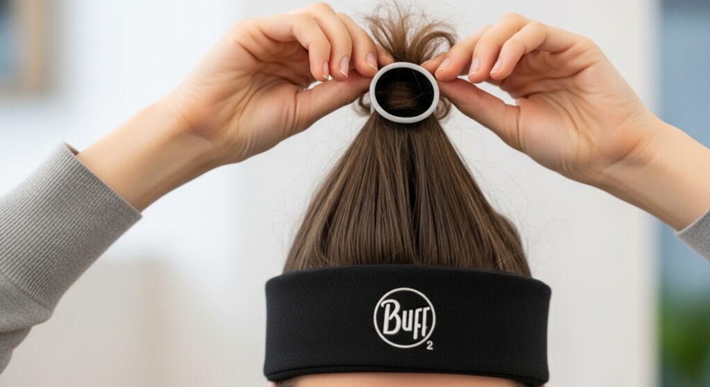 2. The Double Band Twist: Use two thinner Buffs or cut one to create a narrower tube. Place one at the forehead, gather hair, then use the second band about an inch behind the first to catch any shorter layers, creating two small puffs.