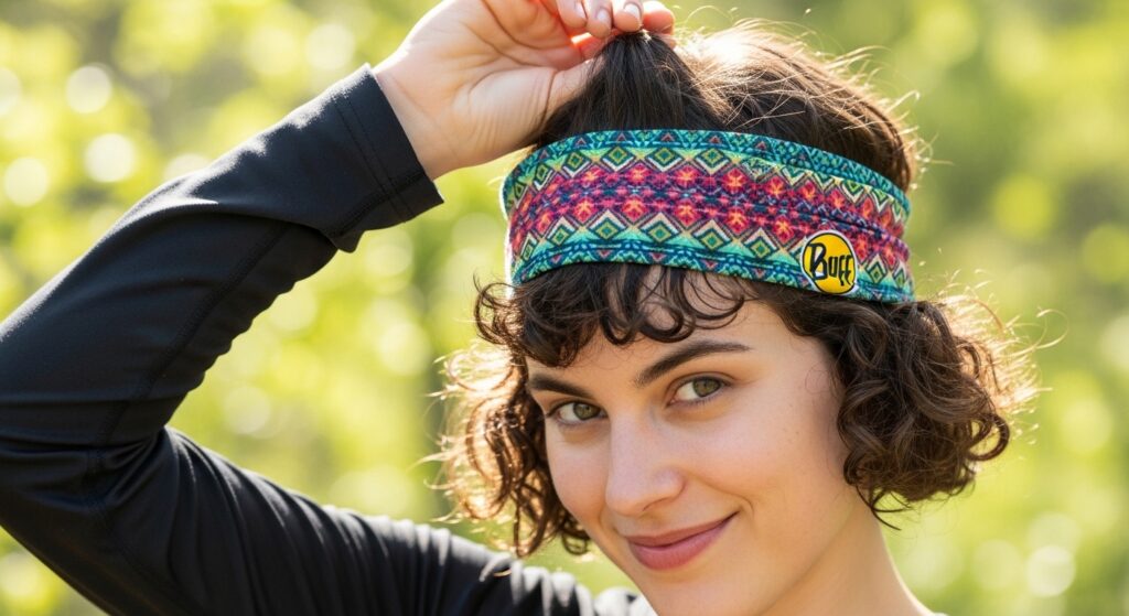 4. The “Bandana” Style: Fold a Buff into a wide band. Wear it like a headband covering your hairline, then tuck all your curls under the folded fabric and secure the tail ends. This is great for very short, tight curls.