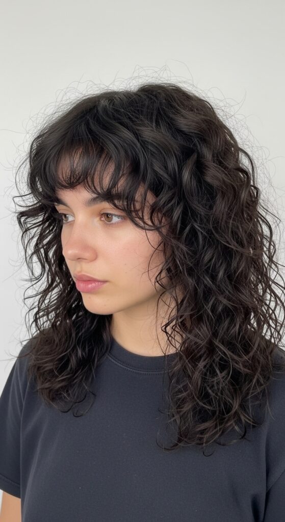 This style celebrates volume and texture. The bangs blend into your layers, reducing bulk at the crown and letting your curls spring to life around your face.