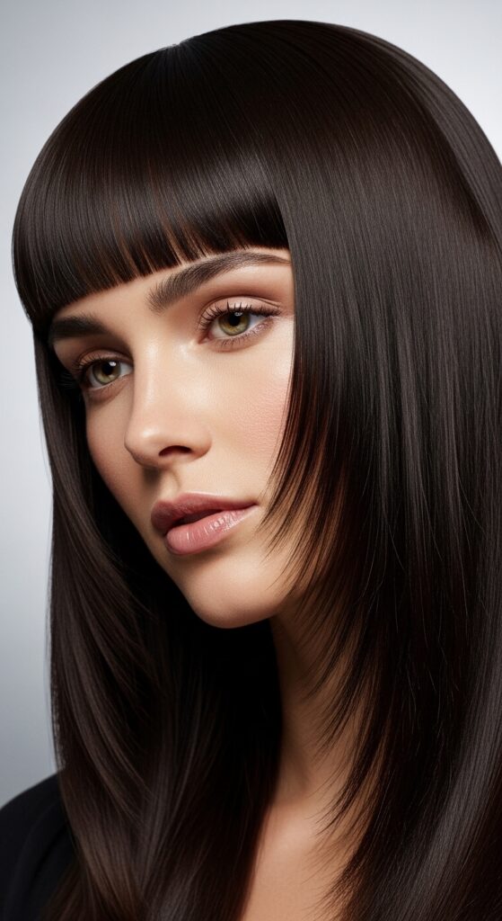 It plays with texture in a brilliant way. The sleekness of the blunt cut makes the airy bangs pop even more. It’s a polished yet interesting look.